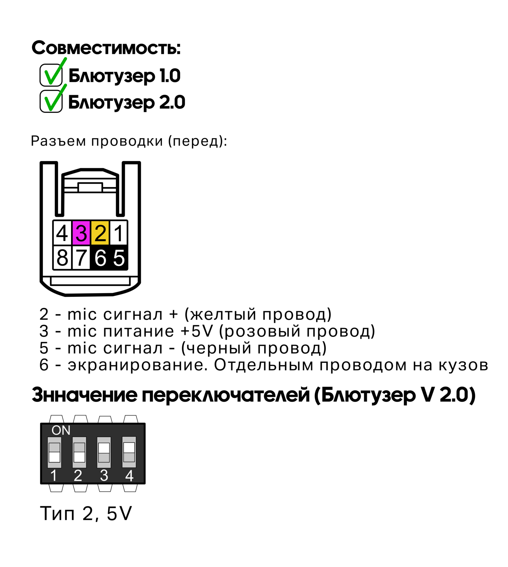 1) Перед началом электрического подключения блютузера убедитесь в том, что в новом головном устройстве (далее ГУ) есть 3.5mm jack вход для подключения внешнего микрофона для громкой связи и этот вход активен.