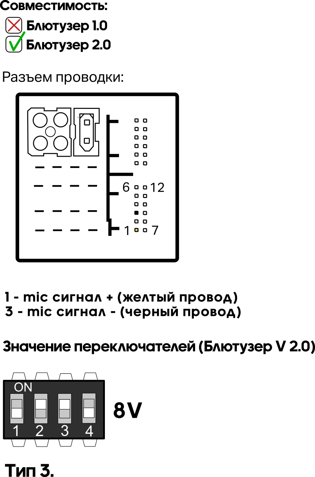 1) Перед началом электрического подключения блютузера убедитесь в том, что в новом головном устройстве (далее ГУ) есть 3.5mm jack вход для подключения внешнего микрофона для громкой связи и этот вход активен.